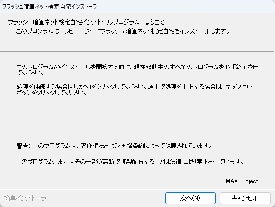 - 以前のインストール時に作成された「フラッシュ暗算ネット検定自宅キット」フォルダが残っていましたら削除してください。