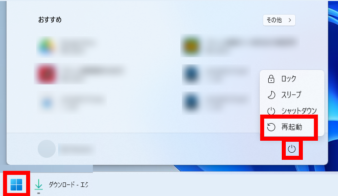スタートメニューの電源アイコンをクリックして、メニューから「再起動」を選択します。